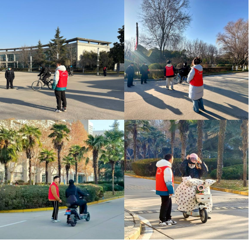 活动当日,学生党员分为多个小组,身着统一的志愿者马甲,在上午及下午不同时段分别前往校园多个车流量及人流量较为集中的路口,在保卫处工作人员的现场引导与安排下进一步明确工作职责,认真细致开展安全宣传教育,协助保卫人员疏导人流及车流,引导同学们有序停放自行车及电动车,提醒过往学生注意避让车辆,及时制止逆行、抢道、不佩戴头盔、行驶速度过快等存在安全隐患的行为,耐心讲解逆行的危害以及骑行时佩戴头盔的必要性,将安全理念深深植入同学们心中,切实提高了大家的自我安全防范意识。