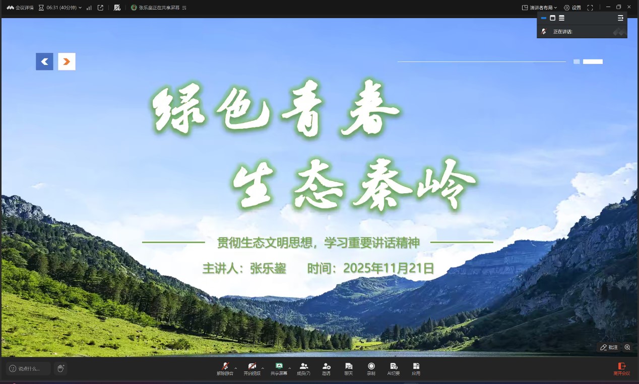 孙欣怡:通过本次学习,我更加明确了党员的先锋模范作用。我们不仅要带头遵守《陕西省秦岭生态环境保护条例》,更要敢于对破坏环境、违规穿越等行为说“不”,让党徽在守护秦岭的一线熠熠生辉。