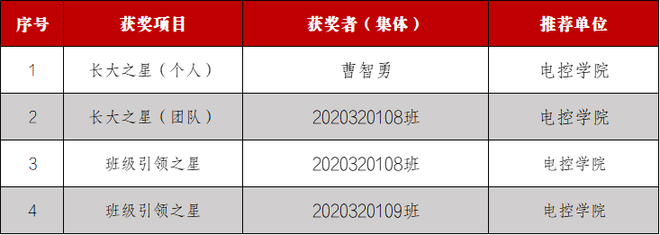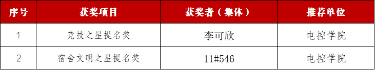 共获得6项荣誉,其中,长大之星(个人)1项,长大之星(团队)1项,班级引领之星2项;竞技之星提名奖1项,宿舍文明之星提名奖1项。