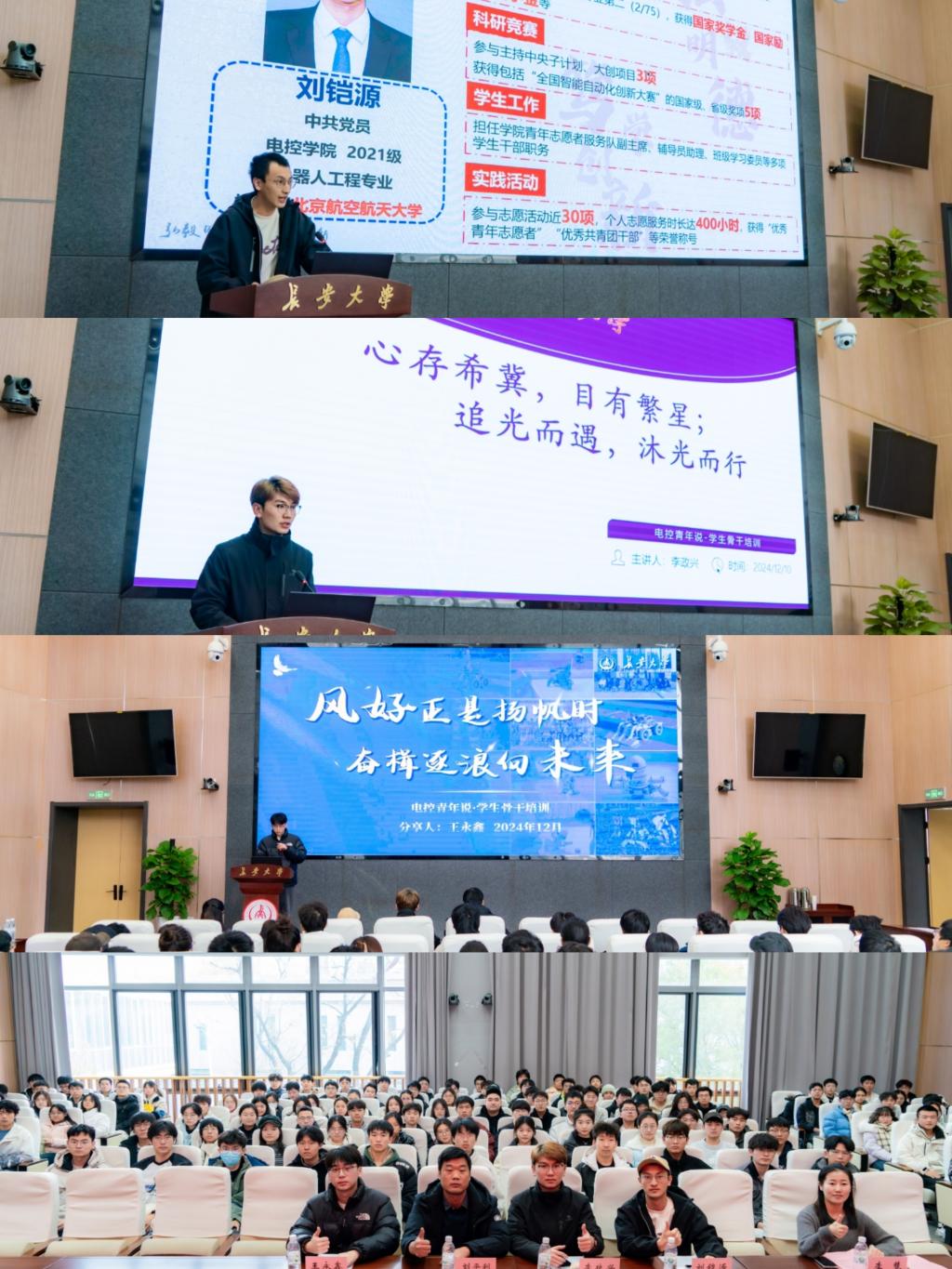 于12月10日下午在北校区师生服务大厅第二报告厅开展“领雁计划”学生骨干训练营(第1期)暨电控青年说。学院学生工作办公室主任刘平利、团委书记李慧,全体团学组织和学生社团成员参加。本次训练营邀请了卓越本科生党支部党员王永鑫、刘铠源、李政兴作为优秀学生骨干代表分享经验。