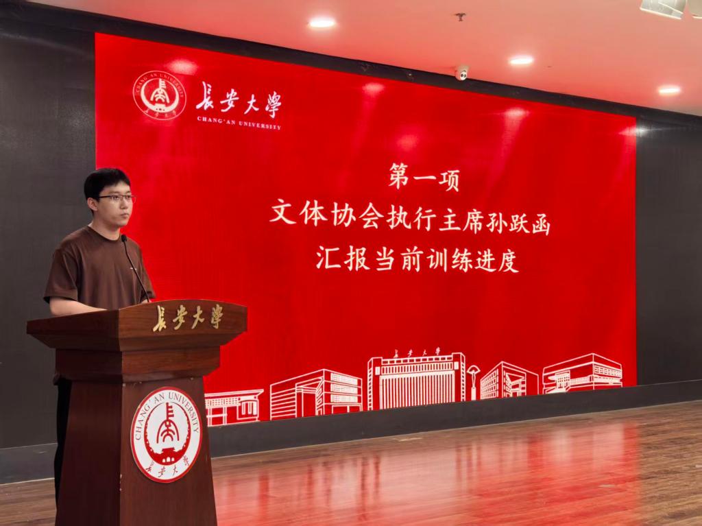 文体协会执行主席孙跃函汇报了训练进度,针对备赛中存在的文体提出学生骨干要主动担当,完善训练与考勤,加强协作,凝聚集体力量。