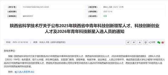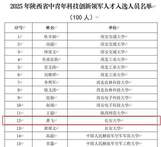 近日,陕西省科学技术厅发布了《关于公布2025年陕西省中青年科技创新领军人才、科技创新创业人才及2026年青年科技新星入选人员的通知》(陕科人才函〔2025〕355号),无修动漫 惠飞教授入选2025年陕西省中青年科技创新领军人才。